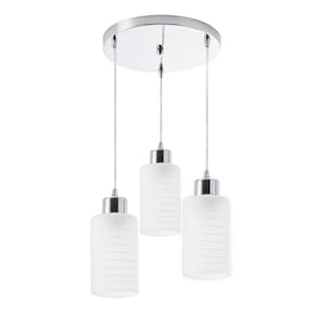 PENDENTE TRACK 3 LÂMPADASPendente em vidro moderno e delicado, que decora o ambiente com muito charme eEstilo.Possui detalhes em linhas desenhadas no vidro que lhe agregam um visual decorativoE super atual.Com possibilidade de regulagem de altura, o que lhe permite ajustar o pendente deAcordo com sua necessidade.Ficha técnica- Tipo de soquete: E27- Ambientes: Interior- Inclui lâmpada: Não- Lugares de montagem: Teto- Unidades por pacote: 1- Cor principal: Branco- Capacidade de lâmpadas: 3- cor: branco