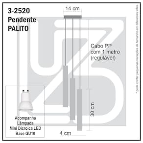 Descrição Técnica: - Modelo: PALITO TRIPLO - Acabamento do corpo: PRETO - Material: Alumínio Usinado - Tamanho (LxAxP): 4cm x 30cm x 4cm - Cabo: PP com 1m (regulável) - Cor do Cabo: PRETO - Soquete: GU 10 - Bivolt: Sim - Canopla: Em metal com 14cm, modelo plano e trava cabo regulador do cabo.
