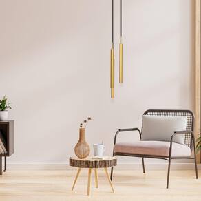 ESPECIFICAÇÕES TÉCNICAS: - Cor: Dourado - Material: Alumínio - Voltagem: Bivolt 110/220V - Soquete: 3x GU10 p/ MR11 (não inclusa) - Dimensões do Tubo: 50 cm de Altura x 4 cm de Diâmetro - Dimensões da Canopla: Diâmetro 18 cm | Furos 8,6 cm - Comprimento do Cabo: Regulável até 110cm - Peso: 800g - Garantia: 12 meses