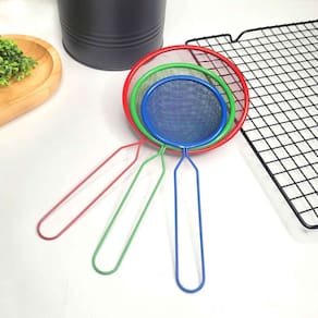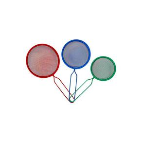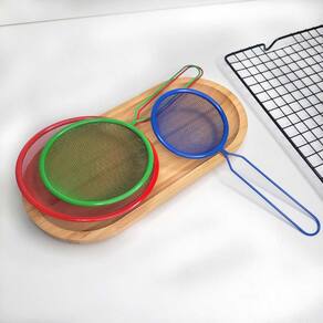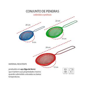 Jogo de peneiras produzidas com liga de ferro, o que torna a peça leve, pratica e facil de limpar. As peneiras sao utensilios de cozinha que todo cozinheiro, seja ele profissional ou nao, tem. Perfeitas para separar um alimento do outro de forma rapida e simples, as peneiras sao muito utilizadas na confeitaria e cozinhas profissionais. Contem: 1 Peneira Grande Medidas: 24 x 12 cm 1 Peneira Media Medidas: 22 x 10 cm 1 Peneira Pequena Medidas: 20 x 8 cm Material: Aço (Liga de Ferro)
