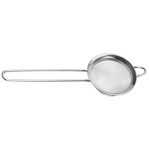Peneira em inox, acabamento em alto brilho, resistência e durabilidade, peça ideal para peneirar com segurança e te auxiliar na cozinha, com detalhe de furo passante no cabo onde possa ser exposta de forma organizada Medidas aproximadas: Peneira 8 cm Profundidade 3 cm Cabo 11 cm Composição: Aço inox