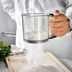 Peneira para Farinha com Gatilho Confeitaria Transparente Cansado de grumos na sua massa Experimente a Mini Peneira de Farinha com Gatilho e tenha resultados profissionais nas suas receitas