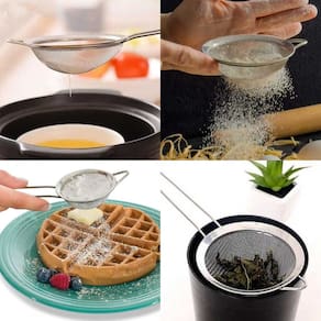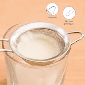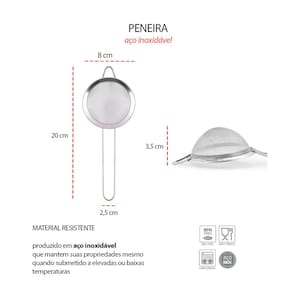 A peneira é desenvolvida em aço inoxidavel, o que torna a peça leve, pratica e muita facil de limpar. Um utensilios que toda cozinha, seja ela profissional ou nao, tem em comum, sao as peneiras. Ideais para separar um alimento do outro de forma rapida e simples, as peneiras sao muito conhecidas na confeitaria. Fabricada com material de alta qualidade e resistencia, ela nao oxida e nao absorve o sabor ou cheiro de alimentos. A Peneira Inox é perfeita para quem procura utensilios com alto nivel de higienizaçao e sem contaminaçao cruzada com os alimentos. Contem: 1 Peneira Pequena Medidas: 20 x 8 x 3,5 cm Material: Aço Inox