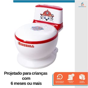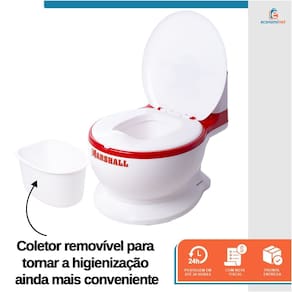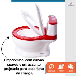 Principais características e benefícios Aparência realista: O design do penico se assemelha a um vaso sanitário, o que ajuda a criança a se familiarizar com o objeto e a entender sua função. Som interativo: A presença de um som de descarga torna o momento do uso do penico mais divertido e envolvente para a criança, incentivando-a a utilizá-lo. Reservatório removível: O reservatório interno pode ser facilmente removido para limpeza, o que torna a higienização do penico prática e rápida. Base antiderrapante: A base do penico é projetada para evitar que ele escorregue, garantindo a segurança da criança durante o uso. Espaço para lenços ou papel higiênico: O penico possui um compartimento para armazenar lenços umedecidos ou papel higiênico, o que facilita a higiene da criança.