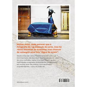 Sobre o livro: Feita de encontros aleatórios, a fotografia de rua é um exercício intenso da sensibilidade do olhar. Associada à prática de vagar pela cidade – ou outro ambiente qualquer –, ela pode parecer dependente da sorte mas, na hora h, a captura do "instante decisivo” (como dizia o francês Henry Cartier-Bresson, expoente máximo desse estilo fotográfico), exige a frieza das decisões rápidas. Enquadramento, exposição, foco, postura, momento: você precisa sair e aperfeiçoar sua técnica se quiser transformar a sorte em imagens impactantes. O britânico Matt Stuart nunca sai sem sua Leica e, em vinte e cinco anos de carreira, tornou-se um dos mais notórios fotógrafos de rua contemporâneos, com um vasto portfólio de cenas espirituosas e desconcertantes, como você verá nas mais de 100 imagens deste livro. Desde entender como ser invisível em uma rua movimentada até antecipar uma ótima imagem no caos de uma multidão, o autor revela em mais de 20 capítulos as habilidades e segredos, conquistados com esforço, que levaram às suas melhores fotos. Ele também explica sua abordagem purista e exclusivamente lúdica da fotografia de rua, deixando o leitor cheio de ideias para usar em sua própria fotografia. Esta é uma oportunidade única para aprender com um dos melhores fotógrafos de rua da atualidade. Muito do que é considerado, estilisticamente e de maneira subjetiva, como fotografia de rua, foi feito entre o final do século XIX e os anos 1970, um período que viu o surgimento de câmeras portáteis, que permitiram essa prática espontânea em lugares públicos. Com esses clássicos aprendemos a nos relacionar afetivamente com as imagens fotográficas e, ainda hoje, em tempos de excesso de imagens e Inteligência Artificial, a captura de uma cena determinante – seja pelo caráter curioso, emblemático ou mesmo banal – é um convite à reflexão e ao afeto.