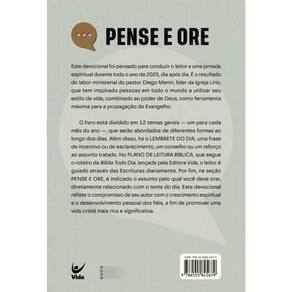 Pense e ore irá conduzi-lo a uma jornada espiritual durante todo o ano. Por meio da meditação diária na Palavra, você alcançará um novo nível de intimidade em seu relacionamento com o Senhor, e será surpreendido pelo agir de Deus em sua vida.O livro está dividido em 12 temas gerais, um para cada mês do ano. Além disso, em cada dia, você encontrará três seções importantes: o LEMBRETE DO DIA, com uma frase de incentivo, aconselhamento ou um reforço ao assunto tratado; o PLANO DE LEITURA BÍBLICA, que guiará você através das Escrituras; e a seção PENSE E ORE, que indica o tópico do dia pelo qual orar. Através desta obra cuidadosamente elaborada, você será capaz de desenvolver o seu caráter e crescer espiritualmente, a fim de desfrutar um ano de aprendizado e comunhão íntima com o Pai.