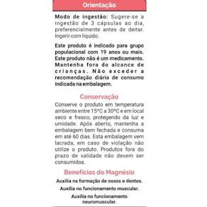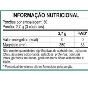 Ingredientes: Bisglicinato de magnésio, dimagnésio malato, taurato de magnésio, sais de magnésio do ácido cítrico e óxido de magnésio. Cápsula: Gelatina vegetal e água.