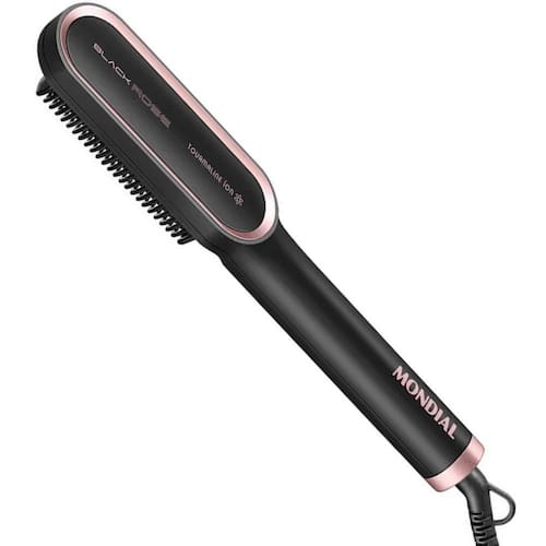 REVESTIMENTO CERÂMICO COM TOURMALINE ÍON A escova alisadora Mondial tem revestimento de cerâmica com Tourmaline Íon, tecnologia que libera íons e fecha a cutícula dos fios, deixando-os disciplinados, macios e com brilho intenso.