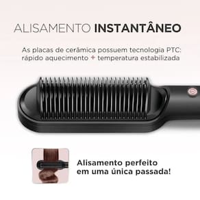 FÁCIL E PRÁTICO DE USAR Basta selecionar a temperatura desejada, aguardar o aquecimento e deslizar a escova pela mecha de cabelo desde a raiz até as pontas. O liso é instantâneo!