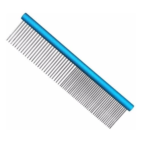 Pente de alumínio estilo greyhound com base tubular de alumínio maciço e acabamento metalizado na cor azul. Dentes de aço inox de seção redonda, sendo 50% dispostos com acabamento fino e 50% no modo grosso. Perfeito para animais de grande porte e pelos espessos.