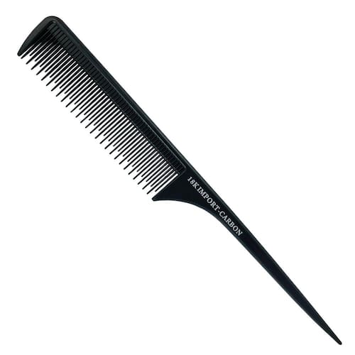 Pente profissional de carbono com cabo pontiagudo. Indicado para as mais diversas específicas: desembaraçar, separar mechas, pentear. ou doméstico. Material resistente e de fácil higienização. Resistente a substâncias, como tinturas, químicas, entre outros componentes. Dimensões do Produto: 233 x 27mm Marca: Não Informado Ean: 7898904360572