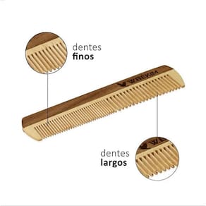 Fabricado em Madeira Faia, leve e resistente Possui dois tipos de dentes: finos e largos, adequados para diferentes tipos de cabelo e necessidades Acabamento natural, proporcionando estilo rústico e elegante Tamanho compacto, ideal para levar em bolsas, mochilas ou necessaires
