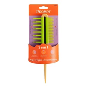 O Pente ProArt Triplo Extraordinário é ideal para desembaraçar ou finalizar o cabelo, os dentes maiores ajudam a desfazer os nós dos fios e os dentes menores completam o perfeito desembarace evitando a quebra dos fios.O cabo é ideal para separar mechas ou enrolar as fitas na hora de finalizar os cachos e seu design ergonômico é ideal para todo tipo de cabelo. O Pente ProArt Triplo Extraordinário pode ser utilizado para espalhar cremes de tratamento ou simplesmente desembaraçar as madeixas. Ideal para penteados e desembaraçar; Resistente ao calor do secador e outros eletrônicos; Possui dentes arredondados que não machucam o couro cabeludo; Resistente e durável. Modo de uso: Pode ser usado em três modos; dentes largos para desfazer nós, dentes médios para desembarace perfeito e cabo ideal para separar e enrolar mechas.Composição: Plástico