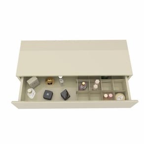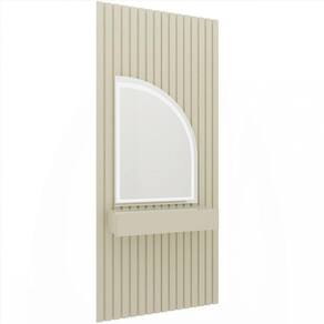 Características: Estrutura em MDP e MDF Espelho de design curvo Nicho com divisórias móveis Espelho jateado com LED Gaveta com corrediças telescópicas Nicho com bordas chanfradas e laqueada Painel Ripado