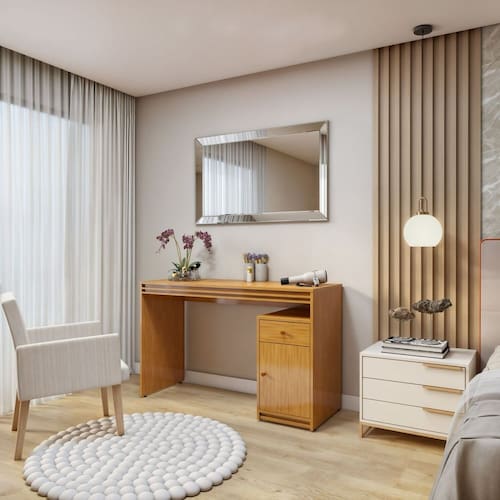A Penteadeira Charlotte, com 1 porta e 1 gaveta, é a combinação perfeita de elegância e funcionalidade para o seu espaço de beleza. Seu design moderno oferece um amplo espaço para organizar maquiagens, acessórios e outros itens de forma prática e acessível. A gaveta é ideal para pequenos objetos, enquanto a porta proporciona mais espaço para armazenamento, mantendo o ambiente sempre organizado. Além de ser uma peça decorativa charmosa, é extremamente funcional, complementando qualquer quarto ou closet com estilo. A Penteadeira Charlotte traz sofisticação e praticidade ao seu dia a dia! Acabamento da Gaveta: Pintura Acabamento da Porta: Pintura Acompanha Banqueta: Não Ambiente Principal: Quarto Complexidade da Montagem: Média: pode ser montado por mais de uma pessoa e/ou necessite de maior conhecimento para montagem Cor: Naturalle Cor do Produto: Naturalle Escala de Brilho: Semi-Brilho Escala de Brilho da Gaveta: Semi-Brilho Escala de Brilho da Porta: Semi-Brilho Gaveta com Chave: Não Itens Inclusos: 1 Penteadeira e manual de montagem. Manual de Montagem e Instalação: https://cdn2.madeiramadeira.com.br/atributo/mavaular/2313151-732-17261460540879.pdf Material da Gaveta: MDP Material da Porta: MDP Material do Puxador da Gaveta: Alumínio Material do Puxador da Porta: Alumínio Material Principal: MDP Necessita Montagem: Sim Origem do Produto: Nacional Peso: 23,8 kg Peso Máximo por Gaveta: 5 kg Possui iluminação: Não Possui Moldura: Não Possui Pés: Não Possui Porta Objetos: Não Possui Portas: 01 Possui Prateleiras: Não Possui Vidro: Não Recomendações de Uso, Manutenção e Limpeza: Limpar com pano macio e levemente umedecido. Não utilizar solventes a base e de inflamáveis. Não utilizar produtos abrasivos. Sapatas Niveladoras: Não Sistema de Montagem: Parafusos. Suporta Até (kg): 40 kg Tampo Basculante: Não Tipo de Corrediça da Gaveta: Metálica Telescópica Tipo de Dobradiça/Corrediça da Porta: Metálica Tipo de Porta: Bater Tipo de Puxador da Gaveta: Externo Tipo de Puxador da Porta: Externo