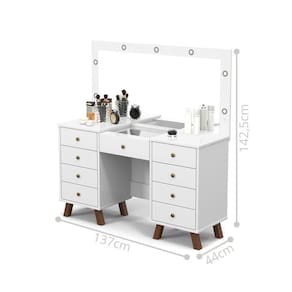 Feito em MDF. Contém 9 gavetas, espelho e suporte para soquetes (lâmpada). Não acompanha lâmpada.