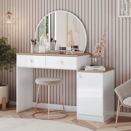 A Penteadeira Agnes foi criada para quem valoriza o autocuidado. Com 01 porta, 02 gavetas espaçosas com corrediças telescópicas, tampos na cor Jequetibá HP, espelho circular e puxadores em ABS. Ela organiza maquiagens, perfumes e produtos de cuidados pessoais. Ideal para quartos, closets e estúdios, oferece sofisticação, praticidade e modernidade ao ambiente, facilitando sua rotina diária.