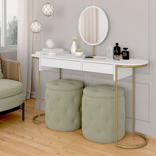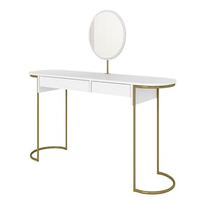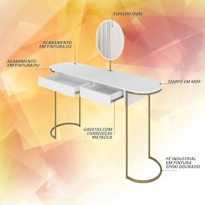 Materiais de Fabricação: - Chapa MDP 15mm / MDF 15 MM - Acabamento: Pintura UV e Pintura PU - Estrutura: Metalon - Corrediças Metálica - Possui 2 gavetas - As gavetas suporta até 2 kg - Acompanha espelho - Tonalidade escrivaninha: Branco - Tonalidade estrutura: Dourado - Estruturado com material de altíssima qualidade, evitando fungos e mofo.