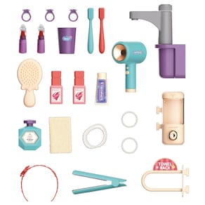 Para tornar a brincadeira ainda mais completa, a penteadeira vem com 24 acessórios de brinquedo incluíndo: 1 secador de cabelo, 1 porta-toalhas, 3 anéis, 2 batons, 1 copo, 2 escovas de dente, 1 torneira, 1 pente de cabelo, 2 esmaltes, 1 pasta de dente, 1 perfume, 1 esponja, 1 colar, 2 pulseiras, 1 tiara, 1 dispenser de sabonete e 1 chapinha, incentivando a organização e proporcionando um ambiente realista de salão de beleza. Este produto não apenas proporciona diversão, mas também estimula a criatividade e a aprendizagem das crianças, tornando cada momento especial.