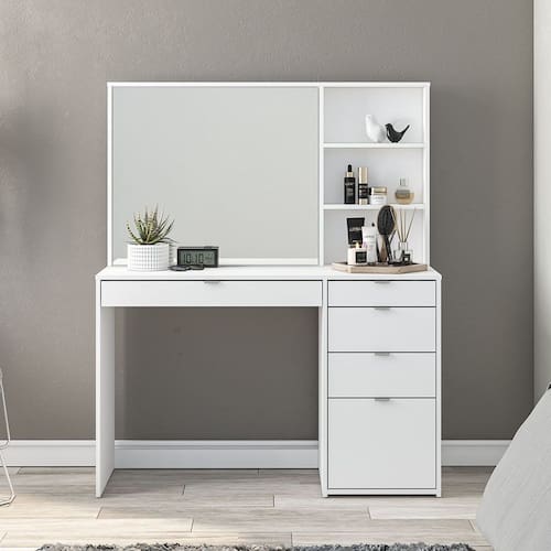 Características: Estrutura MDP Pintura UV 05 Gavetas com corrediças metálicas 02 Nichos com amplo espaço Puxadores de Metal Peso suportado no Tampo: 15kg Peso suportado na Prateleira: 1kg Peso suportado na Gaveta: 3kg
