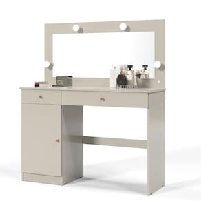 Feito em MDF. Contém 2 gavetas, 1 porta, afiação elétrica, espelho, soquetes para lâmpadas e