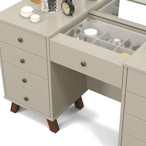 Penteadeira Camarim Eloá 9 Gavetas Retro Moderno Patrimar Móveis A Penteadeira Camarim Eloá é um móvel bastante útil que vai agregar beleza, luxo e sofisticação ao seu quarto. Possui estrutura em mdf de excelente qualidade que proporciona maior durabilidade e resistência ao produto, conta com 9 gavetas sendo a central com colmeia e amplo espaço interno para maior organização dos seus pertences. Designer moderno desenvolvida para lhe proporcionar maior visibilidade na hora de fazer a sua maquiagem, pois conta com leds de alta qualidade. EspecificaçõesPenteadeira Camarim Eloá-100% MDF-Puxadores em metal-Corrediças telescópicas-Colmeia e vidro 04 mm-Iluminação de Led-Pés em madeira maciçaMedidas da PenteadeiraAltura: 142,5 cmLargura: 137 cmProfundidade: 44 cmPeso: 69,10 Kg0,1427 m³Produto NovoProduto Vai desmontadoMontagem por conta do CompradorAcompanha kit e manual para montagem