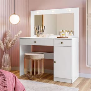Está montando seu quarto? Então apresentamos para você esta bela penteadeira da linha Bella. Com uma porta e duas gavetas equipadas com corrediças telescópicas, sendo uma delas com comeia para melhor organização, perfeito para guardar suas maquiagens e acessórios. O painel com espelho, acompanhado por luminárias em LED proporciona uma iluminação suave e eficiente. Fabricado pela Moval, é desenvolvido em MDP de qualidade. Sendo a escolha ideal para quem busca estilo, conforto e praticidade para compor o quarto dos seus sonhos, aproveite!