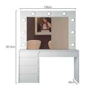 Penteadeira com espelho Berlim é uma união de organização e sofisticação. A belíssima penteadeira camarim deixa para traz os traços Retrô das penteadeiras, e é recriada com detalhes e linhas retas muito modernas além de permitir uma melhor organização. Não Acompanha lâmpadas. Informações Técnicas