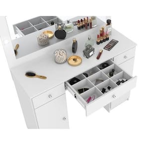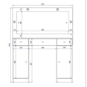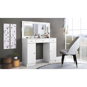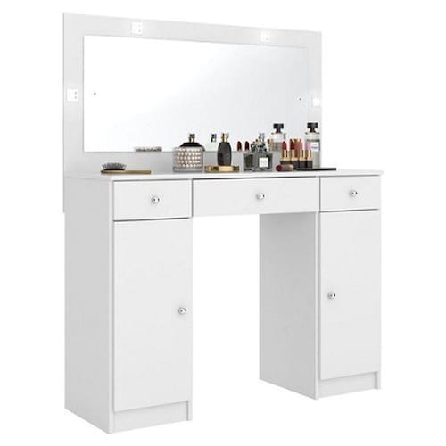 Modelo desenvolvido especialmente para facilitar e organizar pertences de maquiagem e beleza, oferecendo um amplo espelho iluminado por quatro leds, três gavetas sendo a central com corrediças telescópicas e divisor para objetos, além de dois compartimentos com portas para pertences e acomodação de pertences maiores.