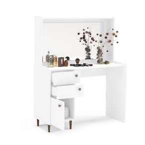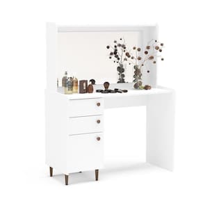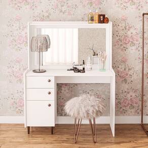 A Penteadeira Camarim com Espelho 1 Porta 2 Gavetas Luisiana Politorno e perfeita para quem ama se cuidar com estilo. Inspirada no design vintage, traz charme e funcionalidade ao ambiente. Com estrutura em MDP 15mm e revestimento UV TEX, oferece durabilidade e beleza. Possui 1 porta, 2 gavetas espacosas e espelho embutido, ideais para guardar cosmeticos e acessorios. Seus pes de madeira garantem estabilidade, tornando-a o destaque do quarto. Puff ou cadeira nao acompanham o produto.