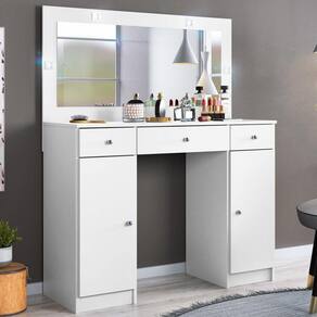 Está procurando uma penteadeira cheia de charme e muito estilosa para decoração de um ambiente?Penteadeira Camarim Carisma foi desenvolvida para facilitar e organizar pertences de maquiagem e beleza, oferecendo um espelho com luminárias de LED garantindo ainda mais modernidade e sofisticação para seu quarto!Suas gavetas possuem amplo espaço, sendo a central com corrediças telescópicas e divisor para objetos, para completar seu design moderno acompanha 2 portas que vão acomodar tudo o que você precisa, de forma rápida, fácil e prática! Sua estrutura conta com material de alta qualidade e resistência, dando durabilidade para o seu móvel.Belíssimo não é mesmo? O que está esperando, garanta a sua!Dimensões do Produto:Largura: 108 cm.Altura: 134 cm.Profundidade: 41 cm.Peso: 37,20 Kg.Outras medidas (Largura x Altura x Profundidade):Espelho: 93,6 x 40 x 0,3 cmCaracterísticas dos Produtos:Material da Estrutura: MDP.Peso Suportado: 3kg por gaveta, 6kg base, 6kg tampo.Acabamento: Pintura UV.Escala de Brilho: Fosco.Possui Pés: Não.Possui Gaveta: Sim.Quantidade de Gavetas: 3 Gavetas.Tipo de Corrediças: Telescópicas.Possui Puxador: Sim.Possui Portas: Sim.Quantidade de Portas: 2 Portas.Tipo de Porta: Convencional.Acompanha Espelho: Sim.Diferenciais:- Design Moderno e Prático.- Luminárias de Led.- Espelho Central.Sistema de montagem: Parafusos/ Cavilhas/ Pregos.Manual de montagem: Sim.Complexidade da Montagem: Média.Conteúdo da Embalagem: 1 Penteadeira.Volumes: 2 Volumes.Garantia do fabricante: 90 dias contra defeito de fabricação.Montagem: Aconselhamos que seja feita por um profissional.Recomendação de limpeza: Utilize pano levemente úmido.Observações importantes:- Produto para uso residencial em ambiente interno, não devendo ficar exposto diretamente ao sol, calor e umidades excessivas.- Pode haver alguma diferença de tonalidade entre a imagem e o produto real, por conta do tratamento de imagens e a calibração de cores do seu monitor.- As imagens são meramente ilustrativas, não acompanham objetos de decoração e eletrônicos.- Confira o estado da embalagem, não devendo assinar o comprovante em caso de danos.- Não asseguramos, no ato da entrega, por subir escadas/elevadores, pelo transporte por guincho em apartamentos ou montagem, desmontagem e instalações. Eventuais despesas são por conta do comprador.- Confira as dimensões do produto e certifique-se de que passará normalmente por supostos elevadores, portas, escadas e/ou corredores de sua residência.