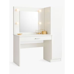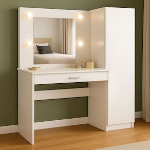 Com espelho iluminado estilo camarim, gaveta grande e porta com prateleiras internas, essa penteadeira é perfeita para quem busca funcionalidade com design moderno.