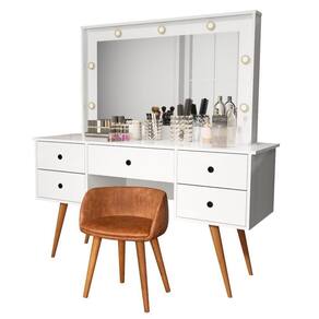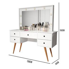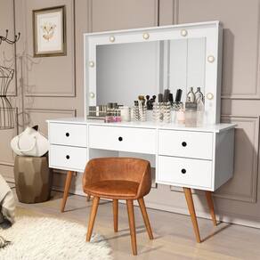 Penteadeira Camarim Com Espelho Led 5 Gavetas Banqueta Inclusa Courino Pé Madeira Branco Penteadeira Camarim Bancada Maquiagem com Banqueta Courino CoresDesperte a sua vaidade e transforme o seu ritual de beleza com a Penteadeira Camarim com Banqueta em Courino. Esta peça deslumbrante combina funcionalidade e estilo para criar um espaço exclusivo dedicado à sua rotina de cuidados design elegante e contemporâneo da penteadeira é acentuado pelo espelho camarim, proporcionando uma visão completa para garantir que você esteja sempre impecável. As luzes embutidas ao redor do espelho proporcionam uma iluminação suave e perfeita para maquiagem e cuidados com a banqueta estofada em courino não apenas adiciona conforto, mas também complementa o visual sofisticado da penteadeira. O courino é fácil de limpar, garantindo pde no seu dia a amplos espaços de armazenamento, gavetas e nichos oferecem organização para seus produtos de beleza, joias e acessórios. Mantenha tudo à mão, facilitando o processo de preparaçã com materiais de alta qualidade, a Penteadeira Camarim com Banqueta em Courino é durável e resistente, garantindo que você desfrute de um espaço glamoroso por muitos anos. Torne o seu o de beleza ainda mais especial com esta penteadeira que une pde, estilo e funcionalidade. Transforme seu espaço e sinta-se como uma estrela todos os dias!MEDIDAS DO PRODUTO MONTADOS:Altura: 150 cm;Largura: 136 cm;Comnto: 45 cm.*NÃO NOS RESPONSABILIZAMOS PELA MONTAGEM DO PRODUTO, VISANDO POR UMA DURABILIDADE MAIOR DO PRODUTO, ACONSELHAMOS QUE A MONTAGEM SEJA FEITA POR UM .**OFERECEMOS 3 MESES DE GARANTIA DE * Marca: Não Informado