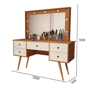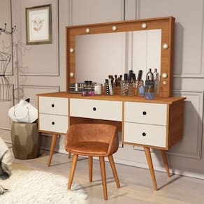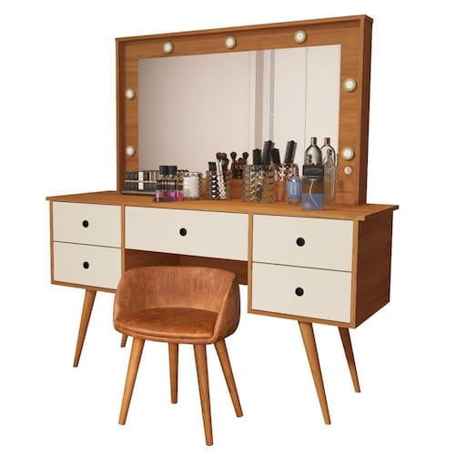 Penteadeira Camarim Com Espelho Led 5 Gavetas Banqueta Inclusa Courino Pé Madeira Nature/off White Penteadeira Camarim Bancada Maquiagem com Banqueta Courino CoresDesperte a sua vaidade e transforme o seu ritual de beleza com a Penteadeira Camarim com Banqueta em Courino. Esta peça deslumbrante combina funcionalidade e estilo para criar um espaço exclusivo dedicado à sua rotina de cuidados design elegante e contemporâneo da penteadeira é acentuado pelo espelho camarim, proporcionando uma visão completa para garantir que você esteja sempre impecável. As luzes embutidas ao redor do espelho proporcionam uma iluminação suave e perfeita para maquiagem e cuidados com a banqueta estofada em courino não apenas adiciona conforto, mas também complementa o visual sofisticado da penteadeira. O courino é fácil de limpar, garantindo pde no seu dia a amplos espaços de armazenamento, gavetas e nichos oferecem organização para seus produtos de beleza, joias e acessórios. Mantenha tudo à mão, facilitando o processo de preparaçã com materiais de alta qualidade, a Penteadeira Camarim com Banqueta em Courino é durável e resistente, garantindo que você desfrute de um espaço glamoroso por muitos anos. Torne o seu o de beleza ainda mais especial com esta penteadeira que une pde, estilo e funcionalidade. Transforme seu espaço e sinta-se como uma estrela todos os dias!MEDIDAS DO PRODUTO MONTADOS:Altura: 150 cm;Largura: 136 cm;Comnto: 45 cm.*NÃO NOS RESPONSABILIZAMOS PELA MONTAGEM DO PRODUTO, VISANDO POR UMA DURABILIDADE MAIOR DO PRODUTO, ACONSELHAMOS QUE A MONTAGEM SEJA FEITA POR UM .**OFERECEMOS 3 MESES DE GARANTIA DE * Marca: Não Informado