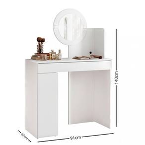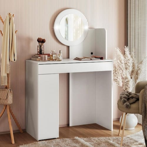 A Penteadeira Camarim com LED 1 Gaveta 1 Porta Áurea Albatroz combina funcionalidade e elegância em um único móvel. Com uma gaveta organizadora espaçosa e corrediças telescópicas, ele oferece funcionalidade e organização para o seu dia a dia. Além disso, o design moderno é complementado por um espelho redondo que traz um toque de sofisticação ao ambiente. As duas luminárias de LED garantem uma iluminação perfeita, ideal para a sua rotina de beleza. Transforme o seu espaço com esse camarim prático e elegante, pensado para proporcionar estilo e conforto em qualquer ambiente.