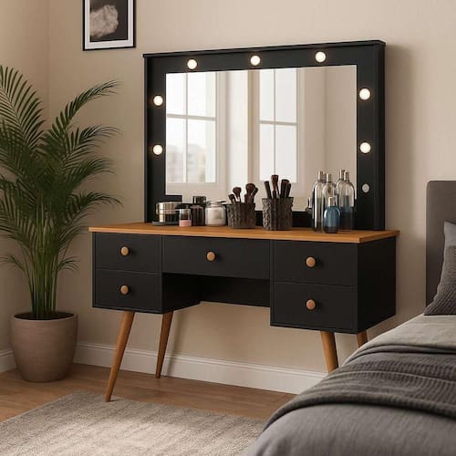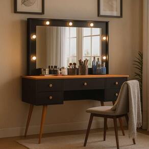 Beleza, praticidade e charme se encontram na Penteadeira Camarim Anaísa. Produzida 100% em MDF, ela une qualidade e durabilidade com um design sofisticado, ideal para transformar seu quarto ou closet em um verdadeiro camarim.Equipada com um amplo espelho central cercado por iluminação em LED, proporciona uma excelente visibilidade para maquiagem e cuidados diários. São 5 gavetas espaçosas para organizar maquiagens, acessórios e itens pessoais com praticidade.O toque final fica por conta dos elegantes pés palito em madeira maciça, que remetem ao estilo retrô e adicionam um charme especial à decoração.Destaques do produto:-Produzida 100% em MDF: mais resistência e durabilidade;-Espelho amplo com iluminação em LED embutida;-5 gavetas funcionais com amplo espaço interno;-Pés palito em madeira no estilo retrô;-Design moderno e elegante.Ideal para quem busca um móvel funcional e cheio de estilo para o dia a dia!MEDIDAS DO PRODUTO MONTADO:Altura: 150 cm;Largura: 45 cm;Comprimento: 136 cm.NÃO NOS RESPONSABILIZAMOS PELA MONTAGEM DO PRODUTO, ACONSELHAMOS QUE A MESMA SEJA FEITA POR UM PROFISSIONALPRODUTO COM GARANTIA DE ATÉ 3 MESES