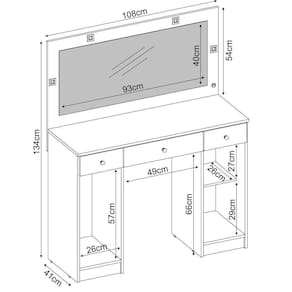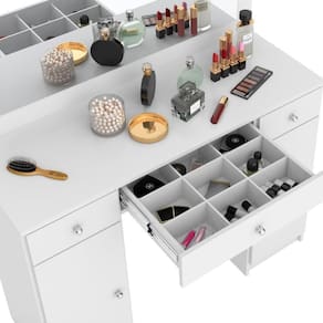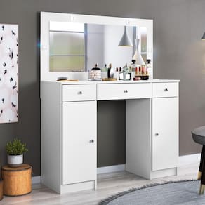 Modelo desenvolvido especialmente para facilitar e organizar pertences de maquiagem e beleza, oferecendo um amplo espelho iluminado por quatro leds, três gavetas sendo a central com corrediças telescópicas e divisor para objetos, além de dois compartimentos com portas para pertences acomodação de pertences maiores.