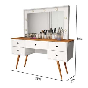 Penteadeira Camarim Com Led Espelho Bancada De Maquiagem Pé Madeira Retrô 5 Gaveta Branco / Nature