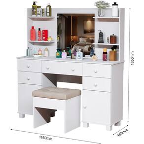 Acompanha banqueta confortável com estofado macio, perfeita para garantir mais comodidade nos momentos de cuidado pessoal. O acabamento branco neutro harmoniza facilmente com diferentes estilos de decoração, tornando o ambiente mais clean e sofisticado.