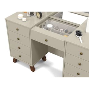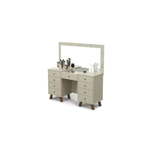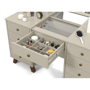 Penteadeira 9 Gavetas Com Espelho Camarim Eloá Patrimar Charmosa e cheias de estilo, a Penteadeira Camarim com Espelho 9 Gavetas Eloá Patrimar Móveis ajuda a decorar seu espaço além de ser extremamente funcional para organizar seu quarto e desafogar os móveis do banheiro. Aproveite a bancada da penteadeira de maquiagem para organizar os produtos que você usa no dia a dia com mais frequência, já que eles ficarão em fácil acesso. Nas gavetas, organize os demais itens com a ajuda de caixas organizadoras e até porta esmaltes. Atenção: A coloração das imagens do produto pode ter diferentes tonalidades dependendo do seu monitor. Ao receber o produto verifique as seguintes informações: Confira a quantidade de caixas e volumes; Consulte se o nome do comprador consta em todas as etiquetas; Verifique se as caixas não apresentam sinais de danos ou violação; Sempre confira seu produto no ato da entrega. NÃO nos responsabilizamos pela montagem do produto. Caso resida em apartamento, verificar se todos os volumes possuem tamanhos adequados ao elevador, Caso contrário é necessário solicitar ajuda para entrega de seu produto até seu apartamento. As imagens são ilustrativas e o produto mencionado nessa compra é o produto do título.