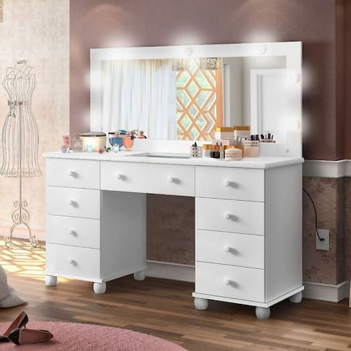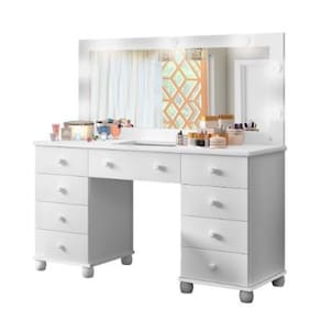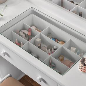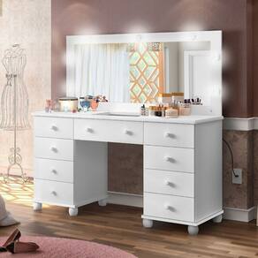 São 9 gavetas que auxiliam na separação de maquiagens, acessórios e diversos objetos, deixando o ambiente mais funcional para o uso diário. Acompanha banqueta que complementa o conjunto.
