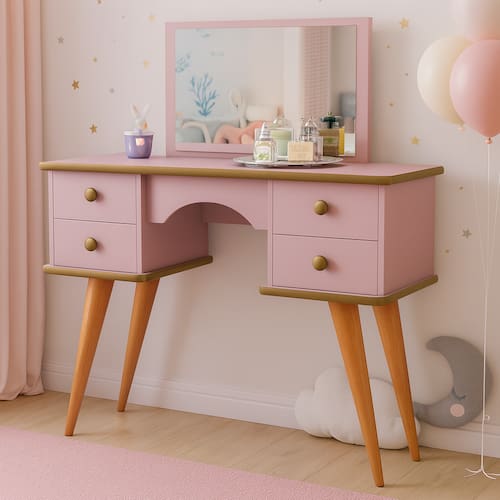 Encante sua filha com esta penteadeira infantil charmosa, feita especialmente para trazer organização, praticidade e um toque lúdico ao quarto. O design com pés palito retrô, aliado ao acabamento delicado em cores suaves, cria um ambiente aconchegante e elegante.
