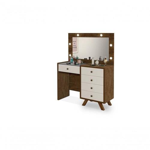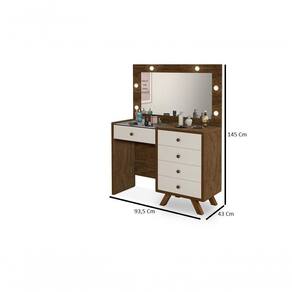 A Lojas Zull trás essa linda Penteadeira Camarim com led Luna para agregar beleza e sofisticação ao seu quarto ou salão de beleza. Possui estrutura confeccionada em MDF de excelente qualidade que proporciona maior durabilidade e resistência ao produto, conta com 5 gavetas com corrediças telescópicas e amplo espaço interno para maior organização dos seus pertences, porta-joias. Painel com espelho e com 6 lâmpadas de LED, interruptor de lâmpada e chicote de energia já incl, iluminação perfeita para sua maquiagem. Pés em madeira maciça de e puxadores em metal na cor ouro envelhecido.