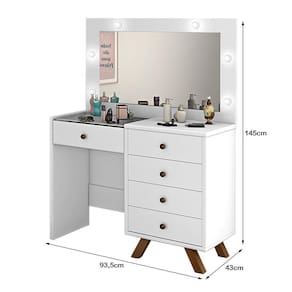 A Penteadeira Luna é 100% MDF, sua pintura é uv anti risco, puxadores em metal com acabamento envelhecido, corrediças telescópicas, possui colmeia na gaveta central, bases laterais e tampo MDF 18mm, moldura do espelho MDF 15mm e 20mm, o espelho tem 3mm e o vidro do tampo 4mm. Possuindo 6 LED de luz branca, pés em madeira de reflorestamento e 5 gavetas com a frente em MDF 15mm.
