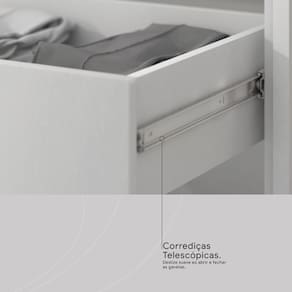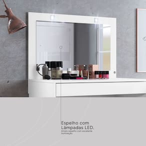 Equipada com um espelho de 44x76,4cm e duas luminárias LED acionadas por plug liga/desliga, oferece iluminação ideal para maquiagem e autocuidado. Possui 1 gaveta com trilhos telescópicos e sapatas anti-risco, garantindo organização e proteção ao piso.