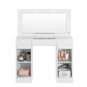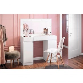 Feita 100% em MDP. Além de ter 3 Gavetas (1 Central com Divisórias e Tampo de Vidro), 2 Portas, 2 Prateleiras, a Penteadeira possui Espelho amplo e 4 luminárias Led.