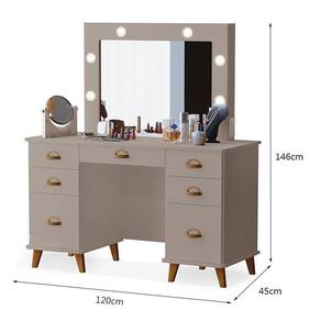 A Penteadeira Camarim New Seul é a escolha perfeita de modernidade e elegância, oferecendo durabilidade e um visual que valoriza qualquer ambiente, inclui uma banqueta com almofada que complementa perfeitamente o conjunto. A penteadeira possui 07 gavetas sendo 01 com colmeia porta joias, tampo de vidro e corrediças telescópicas, 04 leds integrados garantindo uma iluminação perfeita para maquiagem e cuidados diários, incluso tomada, interruptor da lâmpada e chicote de energia, acompanha espelho e pés em Madeira. A banqueta tem uma estrutura resistente, ideal para deixar seu ambiente mais charmoso, possui um assento estofado super confortável, desenvolvida em MDP e pés torneados. Compre agora sua Penteadeira Camarim New Seul com Banqueta Almofadada Mani fabricados pela Luapa Móveis e viva a experiência de se cuidar com estilo todos os dias!
