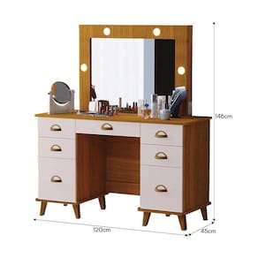 Descubra a elegância e funcionalidade da Penteadeira Camarim New Seul. Feita com uma mistura de MDP e MDF de alta qualidade, esta peça é o complemento perfeito para o seu espaço de beleza. Sua pintura UV confere durabilidade e estilo, enquanto suas 7 gavetas, equipadas com corrediças telescópicas, oferecem amplo espaço para organizar seus itens de maquiagem e acessórios. A gaveta central, com um nicho especial, é ideal para guardar suas jóias e itens mais preciosos. Os puxadores retrô adicionam um toque de charme vintage e os pés de madeira garantem estabilidade e robustez. Desfrute de uma iluminação perfeita com o quadro equipado com 4 jogos de lâmpadas de LED, tomada, interruptor da lâmpada e chicote de energia já inclusos. Além disso, o espelho incluso completa o conjunto, tornando a sua experiência de beleza ainda mais completa e glamorosa.