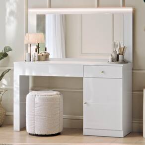 A Penteadeira Camarim Nina traz charme e praticidade para o seu ambiente. Produzida em MDP com pintura UV, oferece durabilidade e ótimo acabamento. Possui 1 porta com dobradiças metálicas e prateleira interna, além de 2 gavetas com corrediças telescópicas, sendo uma com colmeia organizadora. O perfil de LED e o espelho de 3mm garantem um visual moderno e funcional. Com puxadores pontuais e design elegante, é perfeita para quem busca beleza e organização no dia a dia.