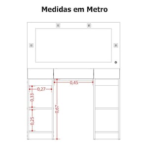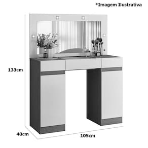 Característica da Penteadeira Camarim Princess: - Estrutura em MDP de alta qualidade; - Acabamento de pintura UV; - 3 gavetas, sendo duas laterais e uma gaveta central com corrediça telescópica e divisórias organizacionais; - 4 luminárias de LED; - Espelho incluso 0,86x0,38m; - Tampo com visor de vidro; - Não acompanha objetos de decoração ou itens de vestuário; - Montagem por conta do comprador;